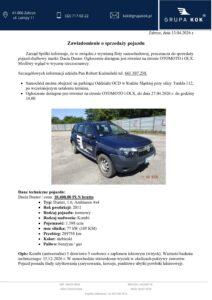 Zawiadomienie o sprzedaży pojazdu Dacia Duster SZ7724F